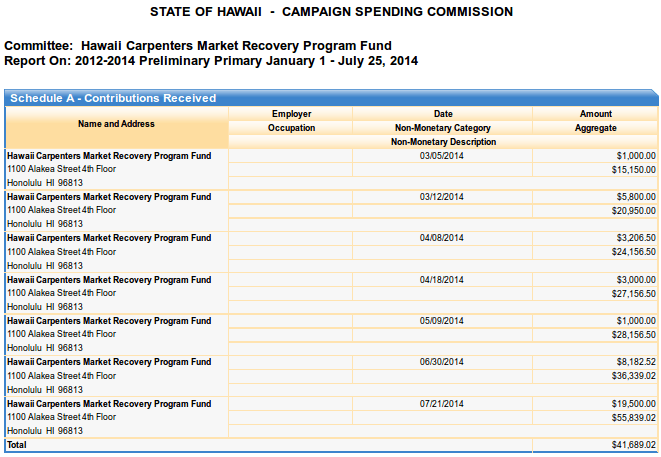 The Hawaii Campaign Commission spokesperson says that the employers of the unionized carpenters are funding Hawaii Carpenters Market Recovery Program Fund. In 2012 the Commission attorney talked with the Fund and they agreed that it would be just fine for them not to list the actual companies paying into this political action committee. When asked if this decision was in writing, both commission employees we spoke with said that it was not.