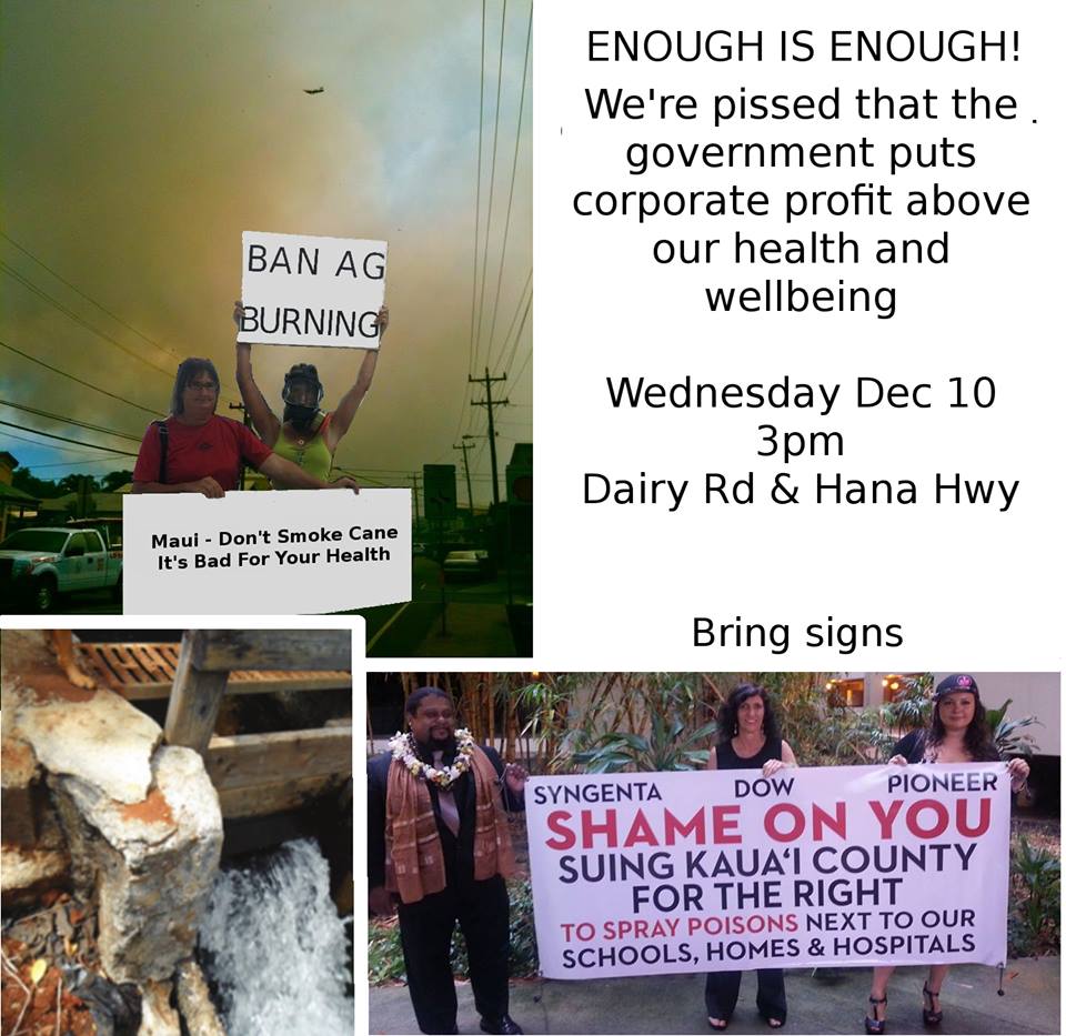 On Wednesday, December 10th, those frustrated with the state’s lack in protecting health held a sign waving in Kahului. More cane burning sign waves are planned for Kihei in an attempt to pressure the Department of Health to start actively enforcing bans on smoke entering people’s homes and businesses.