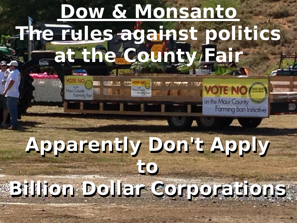 The Maui Fair, a family tradition since 1916, became an object of controversy this week when a PAC trying to derail the GMO Moratorium citizens initiative broke its booth and parade contract and created a political display. Those supporting the voter initiative which will be on the ballot November 4th, played by the rules and had stripped their booth and float of any politicking.